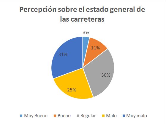 - La ciudadanía considera que se ve afectada su calidad de vida, por el estado deficientes de las carreteras (55%), la falta de mantenimiento de las carreteras (60% ), la ineficiente señalización (40%), el mal estado de las aceras (60%).
